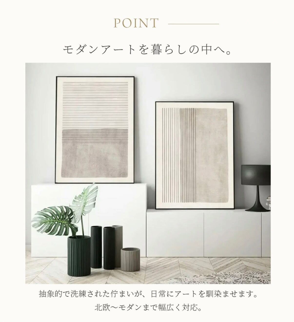 インテリアのポイントになる壁のアート画をお探しの方におすすめのアイテムです。ベージュとグレーの抽象的なデザインがミニマリストなインテリアに合い、生活に彩りを与えます。このアート画は印刷された絵画なので、手頃な価格でオシャレに空間演出ができてお得です。