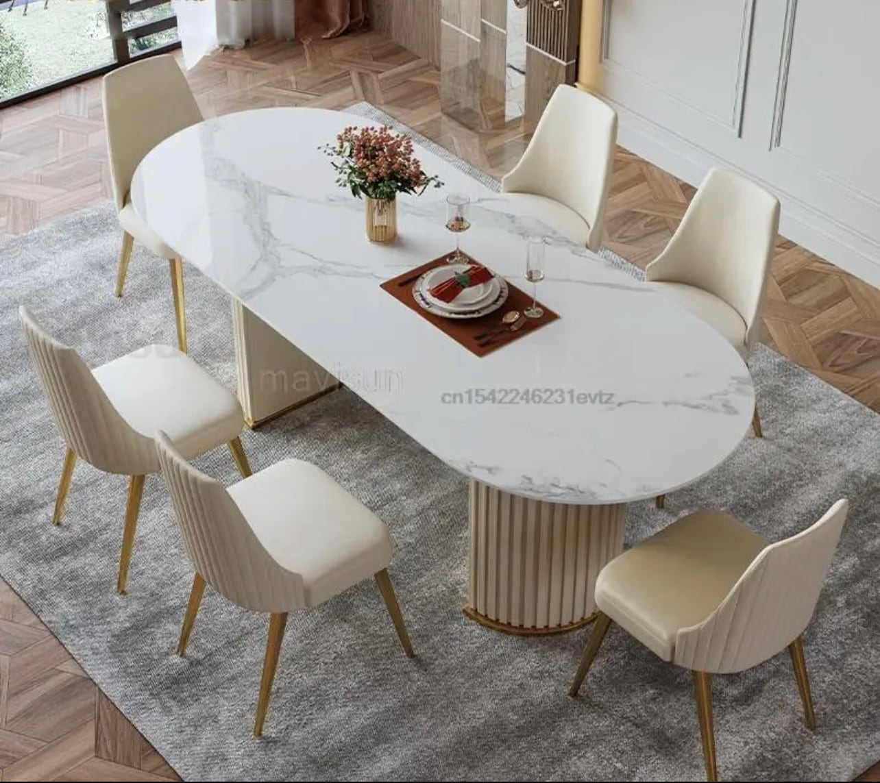 楕円形のテーブルトップは、お部屋の中心に置いてもスペースを取りすぎず、シックな雰囲気を演出します。高級家具としての存在感もあり、おもてなしのシーンにもぴったりです。