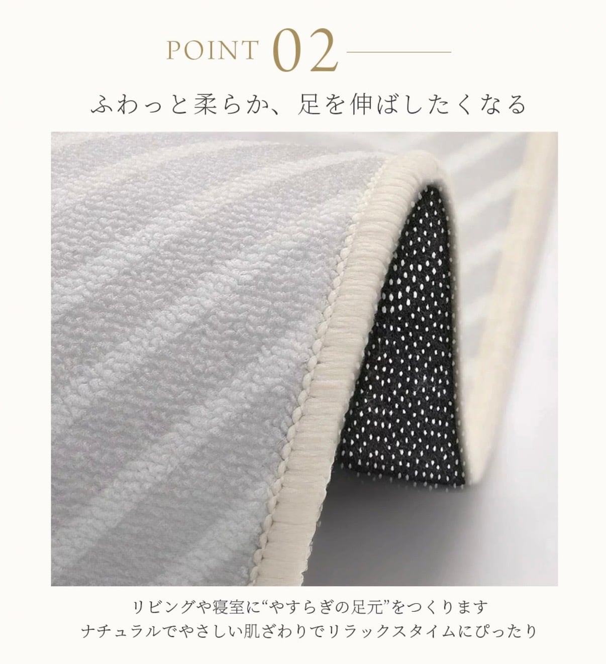 このカーペットは、滑り止めがありますので、安心してお子様やペットと過ごすことができます。また、ベージュのカラーなので、どんなインテリアにもマッチし、空間を広く明るく見せてくれます。